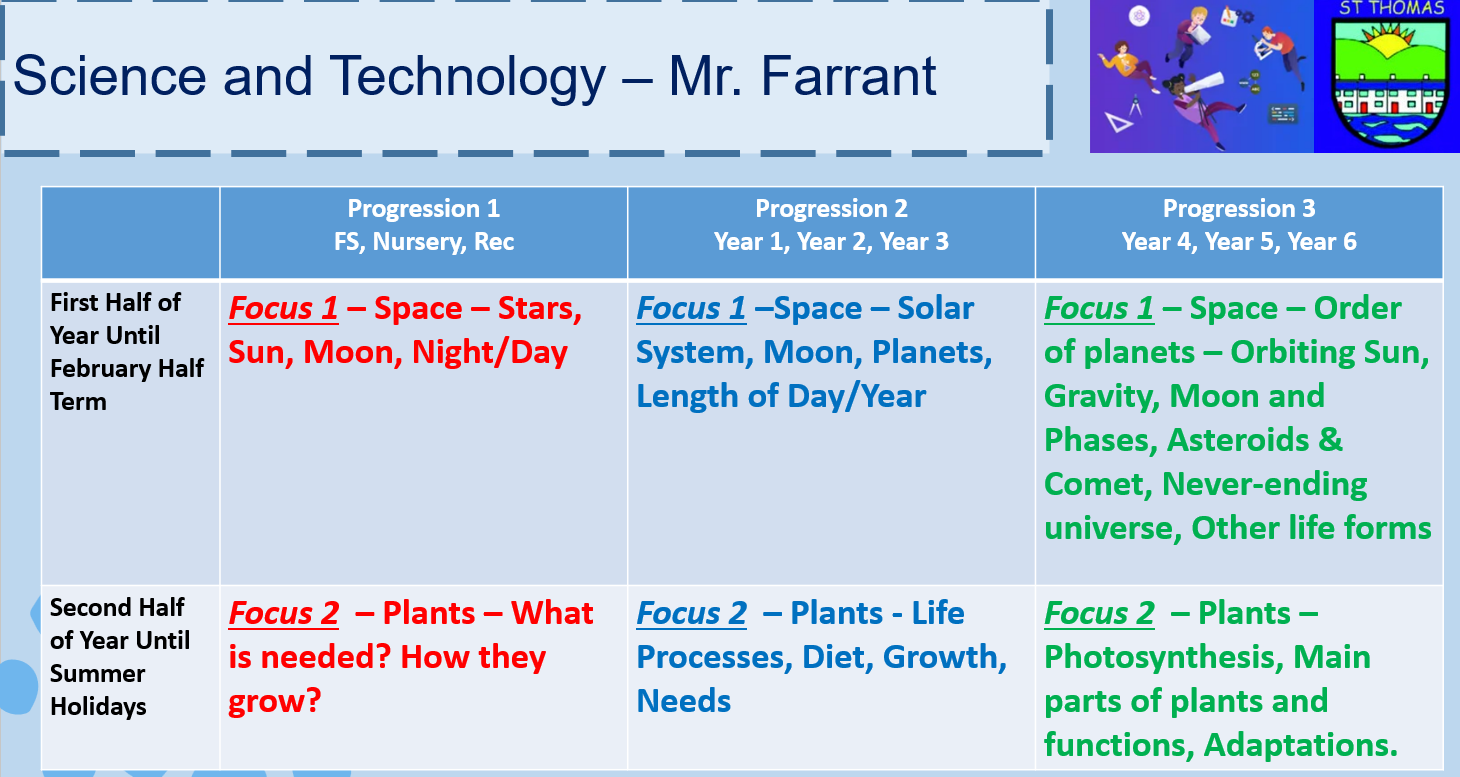 Below is our current Science and Technology curriculum topic cycle. To ensure full coverage of the curriculum, and to provide pupils with a broad and balanced Science education, topics are taught on a three-year rotation. This approach allows pupils in mixed-age classes to study a wide range of Biology, Chemistry and Physica without repetition, while also building knowledge and skills progressively as they move through the school.